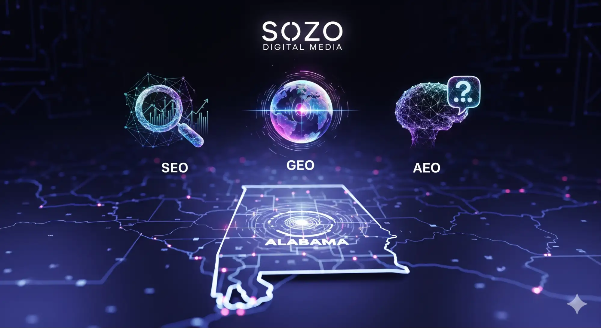 SEO improves your website’s search rankings, GEO ensures your business shows up in local map results, and AEO optimizes content for AI-driven answers like Google’s AI Overviews. Together, these strategies help Alabama businesses gain visibility across search, maps, and AI platforms.
