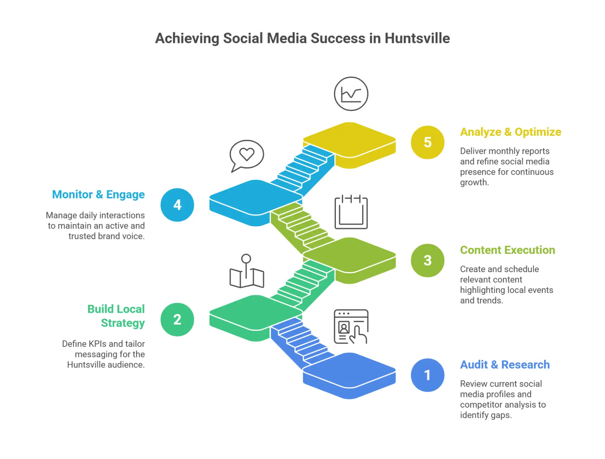 We begin by reviewing your current social media profiles, content quality, and engagement compared to Huntsville competitors. This establishes a baseline and identifies gaps where your brand can gain an edge.